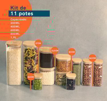 Kit 11 Potes de Vidro com Tampa de Bambu Hermético