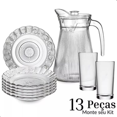 Jogo de Pratos Fundos e 13 Copos + Jarra de Vidro